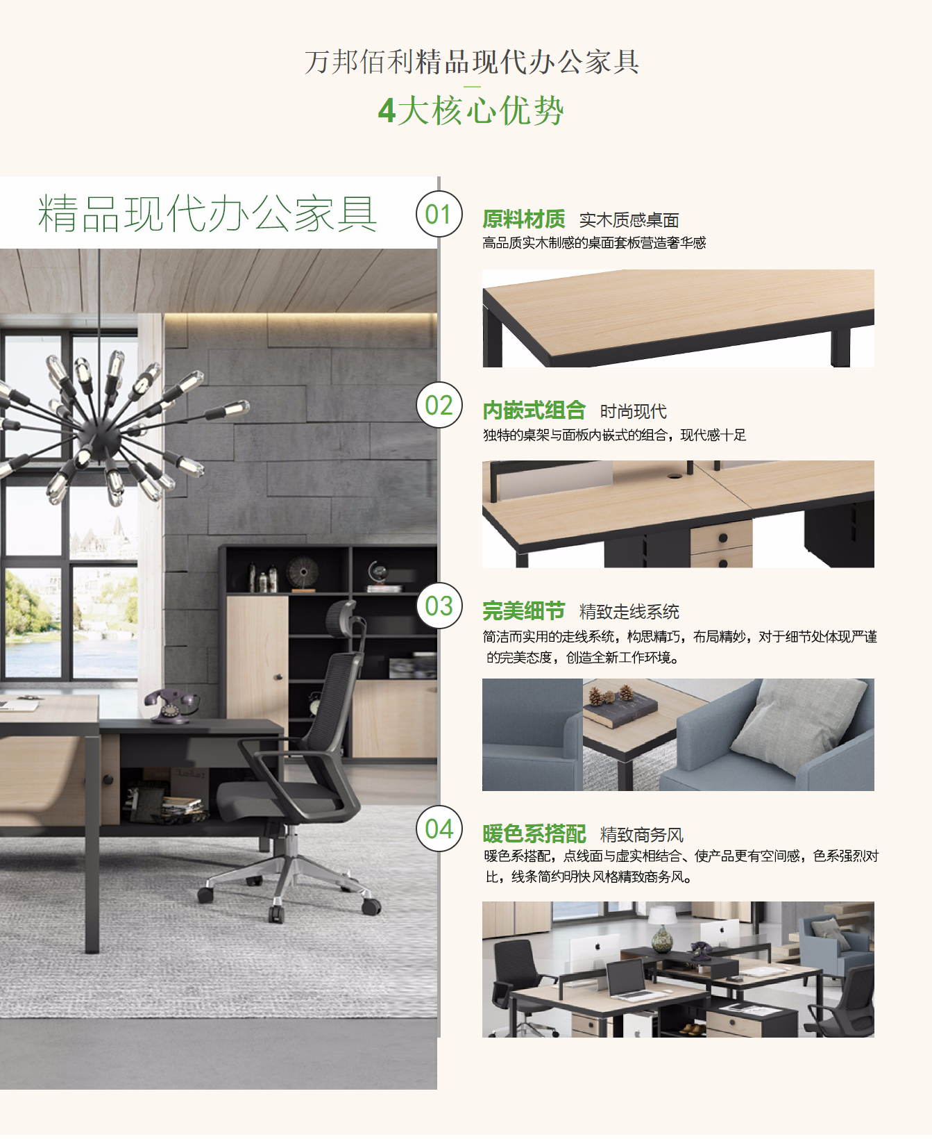 北京萬邦佰利家具有限公司是一家專注于辦公家具生產、批發(fā)銷售的公司。銷售的產品有:班臺、經理桌椅、會議桌椅、員工桌椅、文件柜、密集柜、視屏會議桌、辦公沙發(fā)、學校家具、銀行家具、戶外家具、醫(yī)院家具等產品,公司自成立以來始終堅持以人才為本、誠信立業(yè)的經營原則,堅持用企業(yè)文化提升企業(yè)核心競爭力,使企業(yè)在發(fā)展中處于良好的形象.我公司主要服務于企業(yè)單位的家具定制服務,為各大企業(yè)量身定做整體環(huán)境的家具設計全程服務,我們的整體產品服務...